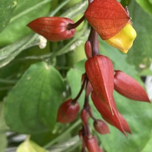 《ツンベルギア(ヤハズカズラ)?》 漏斗状の鮮やかな花と、矢筈(弓の両端を弦で結ぶ部分)のような形をした葉です。 花の色は、黄色、オレンジ、白などがあり、中心部が黒または褐色になるのが特徴🤭 デンパークで見つけたのだけれど花の名前が?です。もしわかったら教えて下さい🤭🌸