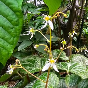 雪の下 (ユキノシタ) ユキノシタ科 半日陰の少し湿った環境が好きな 楚々とした花です。花茎を立ち上げて白い花をつけ 花はダイモンジソウに似ていますね。しなやかな葉は 脈に沿って縞模様の斑が入った丸い形をしています。 初めて花を付けたので 疎らなのでしょうか… マンションに沈む未明の月。