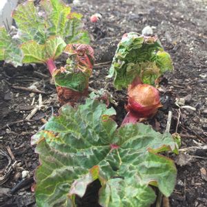 🌱ルバーブの新芽です。 やっと この時期がきたー✨✨ スカスカの畑に見えますが 成長すると 一株 一メートルぐらいのスペースいっぱいになるので、間隔を開けてずーと植えっぱなし🌿 春に少し葉を残して収穫すると、秋にもう一度 収穫できるの😋 茎の部分をジャムやパイにしますが、りんごのよな香り🍎 残念ながら、赤い茎ではなくて、 煮ると見た目がフキのようなので、私は 畑で採れたブラックベリーかカシスを少し入れて色付けするの🤗 タデ科です。 タデ食う虫も好きずきのフレーズに使われてますが、私も家族も好き❤️💕