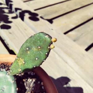 たぶん、ウチワサボテンです。 自然に馴染み、路地で増えた株があって、子が転がっていたので以前お助けしました。 なんとか、芽か?蕾か?つけたようです😌 どなたかが放置したのでしょうけど🌵親さん、今も元気です。