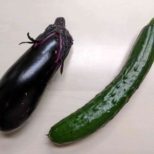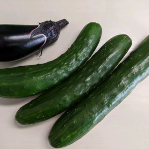 梅雨の中休みに収穫しました。キュウリは収穫遅れで巨大化しました。