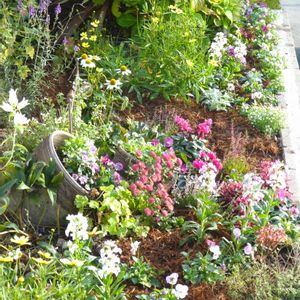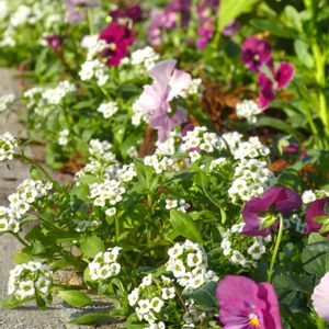 お山の上の工場前の花壇より おはようございます ふんわりアリッサムと ビオラや小輪のパンジー がやっとはいりました パンジーは開花を少しお休みする時期が あるのでビオラと ミックスにして植え込んでいます 春が楽しみ♡ あと少しの花と葉物をいれたら こちらの花壇は完成
