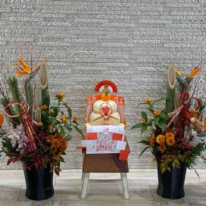 お山の上の工場のエントランスに 毎年年末に納品している 門松風アレンジ 関西では門松は15日に撤去するので あと少しの間エントランスも華やかです