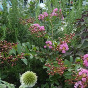 お山の上の工場前の花壇より 夏の花壇が好き いつもあと少しだよ、がんばれ がんばれと声をかけながら夏越し させていく 自動換水の花壇だけど水が行き渡らない ところもあるので 活力剤を入れてジョーロで 水やりしています 三年目の矮性のサルスベリ 今年は可愛いらしく咲いてくれそうです