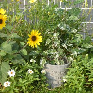 お山の上の工場前の花壇より お盆休みもあと少し 工場は9日から16日まで お休みなので エントランス前の寄せ植えを 工場前の花壇へ運んで管理 ↑ 工場前の花壇だからお盆も通えます☝️ 運んで花壇に置いた 斑入り葉のハイビスカス スノーフレーク まるで最初からここにあったようです