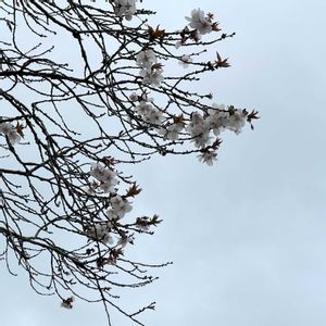 曇り空で寒い朝、出勤途中の里山公園にて 十月桜が咲いていました。 幹には「冬桜」と明記してありました。 🌸🌸🌸⊹ 。˚ ✦ ˖ 。* ⊹