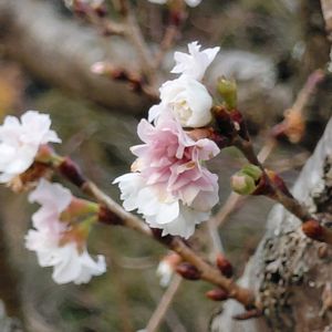 コブクザクラ(子福桜) バラ科 サクラ属 冬桜として称される桜の一種 名前の由来 花一輪につき、2、3個のサクランボがなるという特性 これを子宝に恵まれたものとし名付けられた 開花時期 十月桜や冬桜と同じく、秋から春で10月上旬〜3月上旬 冬から断続的にまばらに咲いているが、春の花が一番美しい 花の大きさは2〜3cmくらいで白い八重咲き 20枚ほどの花弁の丸い縁に切れ込みがある 最初は白だが、時が経つにつれ、芯の部分が赤くなり、花弁もほんのりピンク色を帯びたものもある 八重咲の桜には実がほとんど見られない 人工的に作られた栽培品種 ❶シナミザクラとコヒガンの交配種 ❷シナミザクラとエドヒガン ❸シナミザクラとジュウガツザクラ という説 花言葉は純潔 秋から寒い冬も耐え忍んで、ずっと咲き続けているこの桜の花から元気をもらっています😍