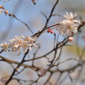 2017.11.19撮影 冬に咲く桜4種 その3 フユザクラ(冬桜・小葉桜・三波川冬桜) 別名:小葉桜(コバザクラ)、四季桜(シキザクラ) 一重咲、白、中輪、秋から春に咲く 花弁枚数:5枚、花期:10月中旬~3月下旬 マメザクラの交雑種。10月頃から咲き始め冬期の間も咲きつづける。冬花は春花に比べ花も小さく小花柄も短いのが特徴。 最近では名前の通り、冬(10~1月頃)に咲く桜の総称としても使われるようになっている。