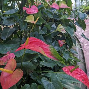 和歌山緑化センターより アンスリウム 綺麗ですね💞葉色も素敵✨ サトイモ科の属の一つ 熱帯アメリカ原産600種以上あるとか うちわの形をしていることから 『べにうちわ』とも呼ばれ 美しく着色するのは、(仏炎苞)と呼ばれる部分、花はひも状の部分(肉穂花序)に多数つき小さくて目立たないそうです☺️