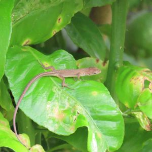 ちびカナヘビさんはここが好きみたい。 レモンの下に咲いてたアナベルを 剪定したら今度はレモンの木に。 葉の奥のレモンの実が だいぶ大きくなってきています♡
