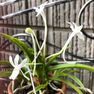 野生ランのフウラン。 千葉県以南に自生する国産のバンダ。 古木の樹幹や岩壁などに着生し、セッコクと双璧を成す言わずと知れた有名種です。 太く長い気根によりガッチリと着生するワイルド派の生育スタイルですが、夏になると白〜淡紅色の可憐で上品な花を咲かせるギャップ系着生ランですね。 花の香りも非常に良く、ヒーリング効果も高いため暑い夏には是非オススメしたい種類です。 ちなみにこれは奄美大島産のアマミフウランと呼ばれる地域変異で、通常のフウランよりも草姿がガッシリしており開花期が1ヶ月ほど遅いなどの特徴がありますね。 個人的にフウランとは相性があまり良くなくて、今年咲いたのはこの株のこの一本だけ。 フウランは性質が強いからと、管理を怠り雑な扱いをし過ぎたのが要因だと思います… 年々扱いが酷くなっているので、それに比例して年々作落ちしております。 冬場の野外放置と夏の潅水不足さえ改善すれば、来年はもっと咲いてくれると思うんですけどね。