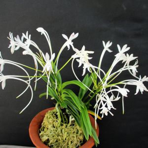 高知産山採り白縞 以前から、うわさ👂で高知の日曜市に山採りのすごい白縞を持ち込んで売買されたらしいと言うことを聞きました😅日曜市の人に聞くと「ほんとにあった‼️その子がこれ」ともってきてくれたフウランです😊 日曜市の人達たいへん優しく、仕事ほっぽらかして高知城を案内してくれたり、いつも安くしてくれたりしました。コロナ禍で行けませんが早く日曜市行きたいです😢