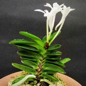 フウラン 旭 愛媛県西条市石鎚産豆葉 今年の花は段咲きになりました😆真ん中の花です😉距がなくなり、何枚か花弁が花茎について段咲きとなっています☺️購入したラン店では『段咲きで仕入れたが段咲きにはならなかった』といってました😉 石鎚産ですが高い標高の石鎚山にはフウランはなく、旧石鎚村の産だと思います✨💕