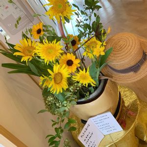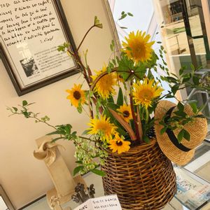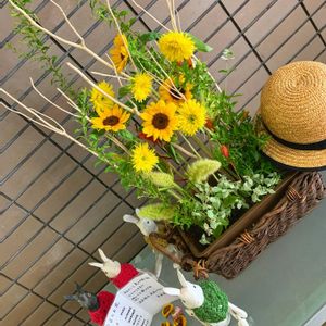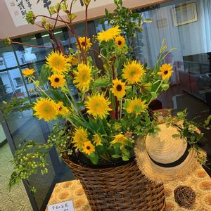 7月の生け込み 今月のテーマは かご編みと麦わら帽子 ヒマワリを主体とした夏らしい作品に統一してみました。