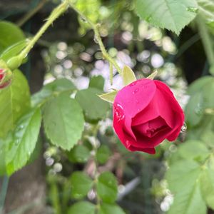 こんにちは ♪ 雨上がりの庭 つるバラの蕾に 雨粒がキラキラ ✧︎*。 明日は 開くかな 🌹 楽しみ ♬︎*.:*