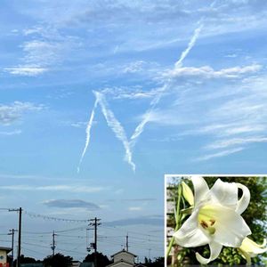 裏庭で咲いてるタカサゴユリ(高砂百合) 花の外側に赤い筋が入っているタカサゴユリ! 赤い筋が入っていないシンテッポウユリ! どちらも咲いています(´>∀<`) オオキンケイギク同様に外来種なので… 花を楽しんだら抜くつもりです😅 2022 8/19 18:15 お出かけ途中の東の空になんと‼️ 綺麗なNの飛行機雲が目に入ったので急いで車を止めて🤳ᐠ( ᐢ ᵕ ᐢ )ᐟ🎶 中々こんなのは見ることないですカラネ😁👌 🏷雲仲間 🏷土曜はお空の発表会