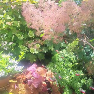 玄関前 スモークツリーが初めて咲いてくれて 華やかになりました カシワバアジサイも少しつぼみが開いてきています
