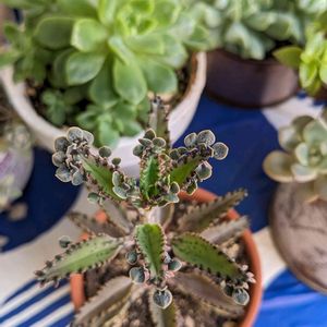 子宝草フェニックス、たぶん斑入り💚 お子様がワラワラ付いてきました😍 以前まりチッチちゃんから貰って初めて見た時は、 「なんだか動物っぽいな、アニマル柄みたい」と思ってしまった💧 まぁ、今でもそう思ってますけど😅 2枚目は妹から貰ったフェニックス。 こちらは大きくなるけどお子様は付かない、何で?🤔