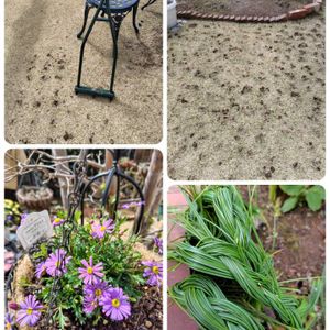 昨日、芝の穴開け頑張りました💦 ↖2代目のエアレーター。↘サフランの葉っぱ、ジャマだから編んでみた😆↙初めて、買ったブラキカム😊ハンギングに入れました😊 今年も、綺麗な芝生キープできますように🙏