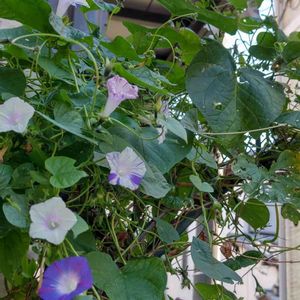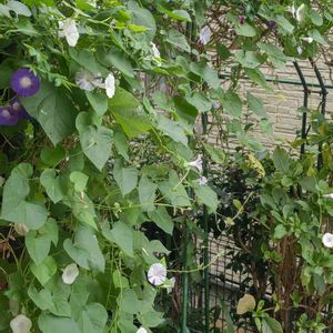 アサガオ 朝顔 バラのアーチにハニーサックルを絡ませ、今は、朝顔のアーチに。 邪道なんだろうけど、評判はいいよ。 花はだんだん小さくなり、花径4センチもない位。 色んな色に咲き分けて、今朝は100輪以上咲いてる。 裏側、アーチの上にも咲いてるよ。 霜が降りたら種は取れないかも😅😣