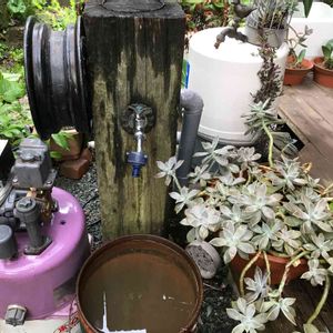 長年活躍してくれた 井戸のポンプ 故障したので、 幼なじみの水道屋に診てもらいました。 「これ寿命だね◯っちゃん」 そうなんだ、無いと困るんだヨ 花の水やり用なんだよ 「新しいの取り付けてあげるよ」 えっえっ😥じゃお願い 自分で出来るのになぁ😅 請求書がコワイ😱 テラスとウッドデッキん作り ポンプを取り付けて 枕木をくり抜き オシャレな小鳥の蛇口まで 取り付けたパワーは今は無い💦 暴れまくりの朧月🌵