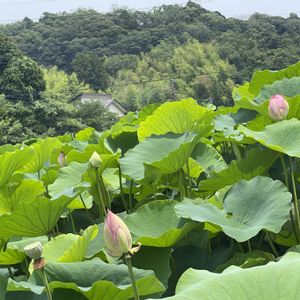 帰省先の愛媛県にて、早朝散歩で見つけた住宅街の蓮根畑♪すごく大きな葉っぱとシャワーヘッドのような花托が印象的♪蓮の実は食べれるらしいです。