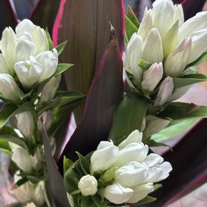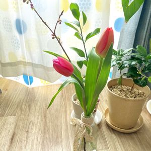 今週のお花 チューリップかわいい🌷 チューリップ 多分、梅 なにかの葉っぱ🌿🤭