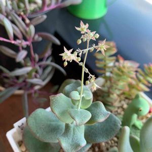 か、可愛い❤多肉ちゃんのお花で、そこまで可愛いと思う事がないんだけど…(笑)この花はホントに線香花火の火花の様で可愛ええ❤いつまでも眺めてる😁葉の縁の淡いピンクとお花の淡いピンクが見とれちゃう♥(ˆ⌣ˆԅ)