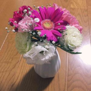 お花の日💐8月7日💐 ってお花屋さんに書いてあったので300円のミニブーケ買ってみた✨ かわいい😍💕 大好きなガーベラが入ったのがこれしか無くて即決(๑❛ᴗ❛๑) めちゃめちゃ気になるデッカいサボテンが居たけど後ろ髪ひかれる思いで帰ってきました😅笑 久々のお花💐 小さくてもあるのと無いのではやっぱり違うな〜