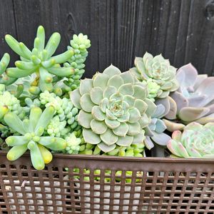 寄せ植えの記録です。 数年前から「小学校の寄せ植え」として引き継いできた寄せ植えがあったのですが(写真5枚目)、相当のびのびゲソゲソになっていたので更新をしました。 といっても、実際に解体してみたら、ほとんど使える苗がなく… 引き継げたのは、アーモンドネックレスと、ピンクプリティっぽいエケベリア、紅稚児、くらいでした。 ブルースプルースっぽいレフレクサムは元気でしたが、増えすぎて収拾がつかなくなっていたので今回は入れませんでした。 似たような雰囲気のカゴ寄せ… 「つまり、わりと放置めでも行ける丈夫そうな種類を植える」 というコンセプトだけ引き継いだ感じです。 もはや「小学校の寄せ植え」…ではないですね。 前のカゴ寄せより一回り小さいのですが 「手提げカゴ寄せ」 と命名しておきます。 使った品種は 虹の玉、恋心、乙女心、桜牡丹ぽいグラプト、レティジア、秋麗、白牡丹、ピンクプリティぽいもの、紅稚児、ドラゴンズブラッド、アーモンドネックレス です。 隙間のセダムは今、コンディションがいいものがなかったのと、寄せ植えのメンテナンスが難しくなるのでほとんど入れませんでした。 やっぱり夏の後の自前苗での寄せ植え作りは難しいです…、 ちなみに虹の玉と乙女心は新たに購入したものです。 過去の様子は 🏷小学校の寄せ植え で見られます。 が、もはや今回はほぼ作り直しの別物ですが(笑)。