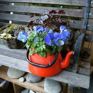 ビオラと赤いやかん❤ このやかんは私が学生のときのだから‼ うん十年前の… ブルーと赤も似合うなあ~💜