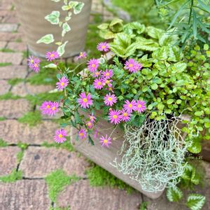 7月も見てくださりありがとうございました☺️ ①② 割れ鉢を使った寄せ植えの姫小菊(ブラキカム)が可愛い🥰 ・ラミウム ガリオブドロン (地植え) ・リナリア パープル (地植え) ・ワイヤープランツ(地植え) ・ハルディン カラーズ姫小菊Bローズのみ使用(HC) ・プラチーナ(室内越冬) ③ 今までは麻紐をグルグル巻いて固定していましたが 今回はこんな感じで…🤭 ④ 引きで…リナリアは咲き終わり✂️してますが また咲くといいな✨ 姫小菊ローズの色が薄い🤔実際には②が近いかな