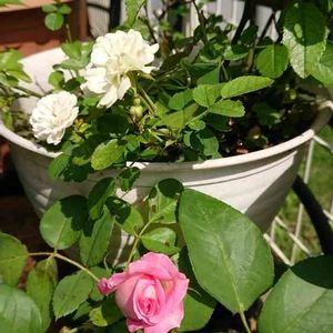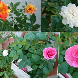 ミニバラ3種です(*´・ω・`)b 左上がバミューダ・フォーエバー、 左中央と左下がグリーンアイス、 右上と右下はローマ・フォーエバー バミューダさんは絞りが可愛いのと赤と黄色の元気カラーが魅力です。大変丈夫で、ウドン粉病も少しかかるくらい、しかも自力で回復しますねー。雨の当たらないベランダ栽培なんで黒星病に対する耐病性はわかりませんが、ウドン粉には強い印象です(*´・ω・`)b販売時の小さい苗の時は花もちょっとショボめですが、少し大きくなるとなかなか美しい形で絞りカラーの花を咲かせるので、花色に抵抗がなければ初心者さんにオススメのミニバラですねv(・∀・*)樹形は半横張りかな。 グリーンアイスは大概のバラ愛好家には好かれる人気者ですよね(*´・ω・`)bトゲがね、キツイね(´-ω-`;) ローマ・フォーエバーも思ったより丈夫ですねー。蕾のガクが割れてローズピンクの花びらが見えてます♪(o・ω・)まぁ、この暑い最中なので小さい花になるかなとは思いますが。