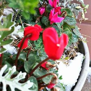 玄関の寄せ植えの中のガーデンシクラメン。奥のピンクのは、11月に我が家へ。手前の赤いのは、家に来て2年目。夏から秋にかけて、たくさんの葉を繁らせました。 でも、ある日を境に葉がかじられてしまい、すっかり寂しくなってしまいました。犯人も分からずじまい。そこで、花は咲かないだろうと諦めて、新しいガーデンシクラメンを買い、一緒に寄せ植えに入れておきまさた。そしたら花が咲き、これからもどんどん咲きそうでうれしいです。雪の中、ほっとする空間です。