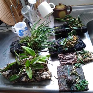 ①②シンクの窓辺に吊るしてるデンドロビウムとミニカトレア。 思いついた時にぬるま湯を掛けてあげます🚿 ③今日は2/5ですよね。 2/3に黒い舗装が見えるまで除雪した道なのに、また30cmほど積もりました😰 うちと空き地の境に大きな石があって、車をぶつけないよう目印に棒を立ててあるんです。 昨夜10時に一晩でどれくらい積もるのかと、その棒に目立つ蛍光ピンクのテープを巻いておきました。 結果は10cm増えたかどうか。今日は風が強くて雪が飛ばされたのかもしれません❄