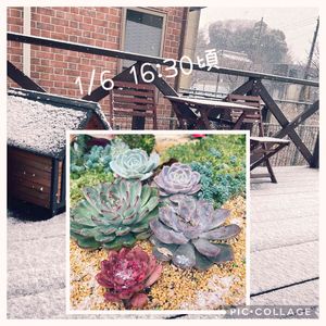 うわぁ〜😖-7℃💦 昨日は初雪が降り、外は雪景色です☃️ 多肉にも雪が積もってる😣 外置き多肉はカチンカチンに凍っています。 葉挿しっ子も凍っちゃった😱 多肉棚の多肉は無事だろうか? 怖くて確認できない💦💦💦