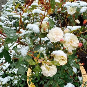 おはようございます🤗 寒い朝です🥶最低気温は4℃でした🥶 札幌の平地でも初雪❄️ 10月の初雪は7シーズンぶりだそうです ①今月初めに咲き始めた イヌラ夏小町がまだ咲いてます💛 今年はこの2つ🌼🌼だけでしたが 長く見られて嬉しい☺️ ②ブルーベリーの葉っぱもいい色になってきました❤️ ③シロクジャクは一昨日の夜からの雨〜今朝の霰で… あられもない姿に(霰だけに🤣) ④⑤プランターには雪が残ってました(8時頃) 明日の朝はさらに冷え込む🥶ようだけど、それ以降はまた少し暖かさが戻るようです☀️ あくまでも北海道民にとっての【暖かい】ですが😅