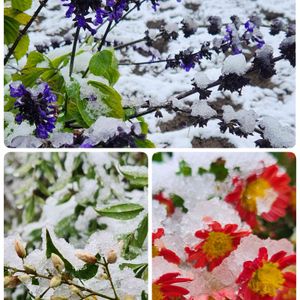 初雪❄️もう1枚 ↘ベランダでの朝 ↑室内に入れて10分後 ↙さらに30分後 マリア様おひたし状態から復活✨✨