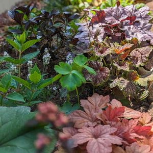 こんにちは╰(*´︶`*)╯♡ 2枚目です😚 半日陰花壇のカラーリーフ🌿 色とりどりのヒューケラが綺麗です (=´∀`)人(´∀`=) ゲウムの葉っぱも枯れずに綺麗なグリーンなのでお花の後もカラーリーフとして楽しめます💕 写真の上の方は、紫陽花さん達がスタンバイ中💕 紫陽花とこの写真の間に、以前投稿のローズバローさんがいます💕 🏷️8日は葉っぱの発表会 参加させてくださいね🌿