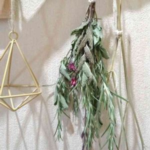 ローズマリー、チェリーセージ、(アップル?)ミントでドライフラワー スワッグって言うの? 前を通るたびにいい香りがする