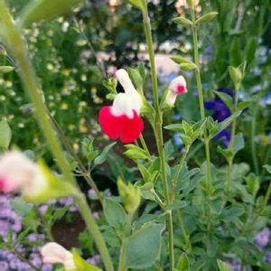 チェリーセージ 夏は真っ赤だった花、気温が低くなってくるとだんだんと白が多くなってきました。葉っぱが赤くなっていて可愛い❤️手間要らずで育てやすいですね。