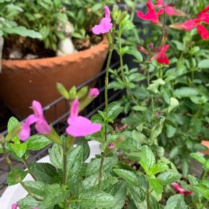チェリーセージ 三色揃いました😊 淡いアプリコットとピンク、紫でしたがどんどん色が濃くなってきた様な💦 紫だった子は真っ赤に💦何故だろう〜🤔
