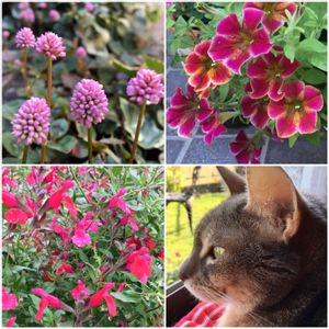 ポリゴナム。ペチュニア マジシャンレッド チェリーセージ。飼い猫のクーちゃん🐾