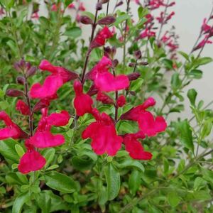 こんにちは 雨ですね☂️ チェリーセージの花 ヒラヒラお花が蝶のようです