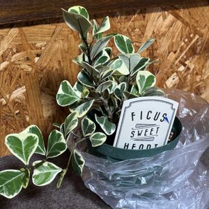 7月5日(土)購入 フィカス・スイートハート (トライアンギュラリス斑入り) 三本立てで一本枯れて抜いたからと店主のおじさんが「300円でいいよ」と言って下さって、お買い得でした。(完品なら870円)