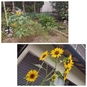 こぼれ種ヒマワリのその後❗️ こんな感じになりました🌻 下のは、何やら一本の茎から、幾つもの花が… こんな咲き方だっけ…