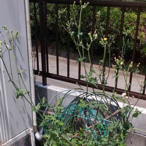 オニノゲシでしょうか… 放ったらかしてたら、こんな事に❗️ 後ろの針金はお気になさらずに… 葉っぱの形状から 「ノゲシ」でした😄 たつみさん、ありがとうございますm(._.)m