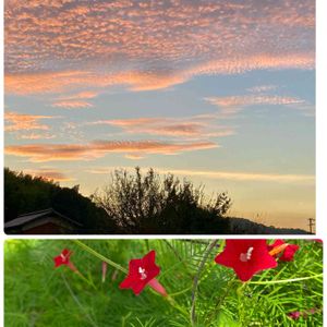 今日は冷たい朝でした。 夏☀️と秋🍂が、 入り混じった不思議な季節💦 空き地には朝顔がいっぱい💦 風船かずらはまだまだ元気🎶 なのに… ハナミズキは真っ赤に🍁紅葉🍁 朝顔も年中咲いてる琉球朝顔じゃ無くて、普通のだと思う。 やはり気候は変⁉️