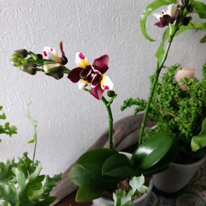 胡蝶蘭チームの開花一番乗り🦋 この一年、 ・粒肥料あげなかった(液肥のみ) ・例年より2、3度くらい寒い部屋で越冬 (暖かい部屋は乾燥が激しいので) ・2月も悪天候続きで日光浴不足だった ⏬ 結果、予想通り花数減らしました。 開花まで持ちこたえられずシケる蕾も。 ホラ👆1つシケてるでしょー 今年は過保護気味にして比較してみるつもり。
