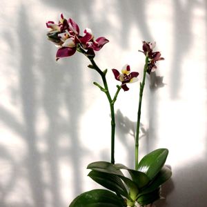 個性派ファレノプシスを見つけました。 しかもスーパーで! 段ボールトレイに入れられた、白い普通のミニ胡蝶蘭に混ざって1ポットだけ👀 ネームタグも付いていないアナタはだぁれ? GS内にもお友達が見つかりません。 画像検索してみたら‘ヴァロン’という品種に似てますが、合ってますか? 花弁に入るブチがこんなにランダムじゃないような気もします。個体差かな🤔 胡蝶蘭にしては珍しく香る品種とのこと、確かにほのかに香っています。 ②③お顔のアップ 開花するとき、茶色いセパル(萼片)から白いペタル(花弁)が覗く様子もたまらん🥹 ④蛍光灯下で見るとチョコレート色。 葉っぱが14枚も付いてます🌿 今後にも期待大。